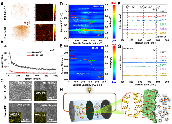 为了更深入地了解MIL101-GF的催化机理,分别进行了飞行时间二次离子质谱(TOF-SIMS)、SEM和原位拉曼测试。循环后的TOF-SIMS图像表明,在MIL101-GF的作用下,只有少量的MgS且能够均匀分散,SEM中Mg负极光滑且表面硫含量较低,说明大部分多硫化物在MIL101-GF的作用下转化。原位拉曼结果进一步表明,MIL101-GF能够抑制多硫化物的穿梭,促进多硫化物的催化转化。具有多级孔结构的MIL101-GF通过孔筛选,可以有效催化大Mg(solvents)x²⁺团簇的解离,迅速形成游离的Mg²⁺,进而参与后续的硫/硫化物转化。首先,MIL101-GF对多硫化物起物理屏障作用,在一定程度上抑制了穿梭效应。其次,MIL101-GF具有电催化和虹吸功能,通过隔膜将大量的游离Mg²⁺释放到正极/电解质表面。最后,均匀分散且丰富的活性位点与固定的多硫化物和界面处大量的游离Mg²⁺结合,使得多硫化物快速转化,MIL101-GF上均匀的导电结构有利于快速的电子传导,最终催化Mg-S电池中硫/硫化物的转化。