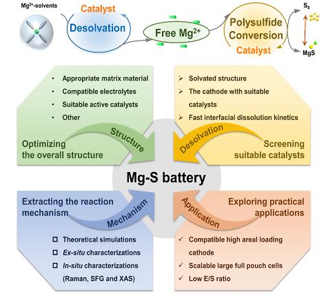 结合前期镁/锂/锌电池的相关研究基础(Energy Environ. Sci.,2024,17,3765-3775; Adv. Funct. Mater.,2025,2506397; Adv. Mater. 2023,35,2302828;Adv. Funct. Mater. 2023,2302624;ACS Nano 2023,17,2,1653;Adv. Funct. Mater. 2023,2212499; InfoMat. 2024,6,e12558; Adv. Mater. 2025,2501079;Nano Lett. 2025,25,3756-3765;Adv. Mater. 2024,2402792;Adv. Sci. 2024,2401629),中国科学院苏州纳米所蔺洪振研究员联合德国卡尔斯鲁厄理工学院王健博士综述了Mg2+脱溶、Mg2+在界面和正极内部的迁移以及硫转化等高能垒过程的研究进展,突出了上述过程之间可能的耦合方式,进一步综述了在提高电导率的前提下加速脱溶剂和硫转化动力学的级联催化策略。