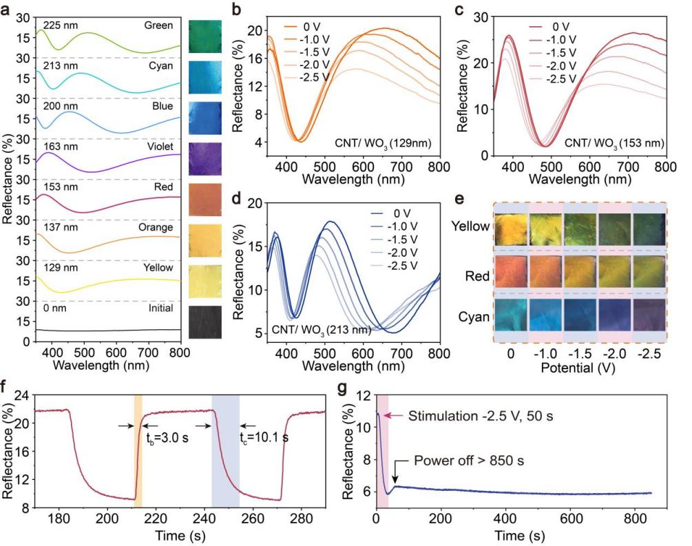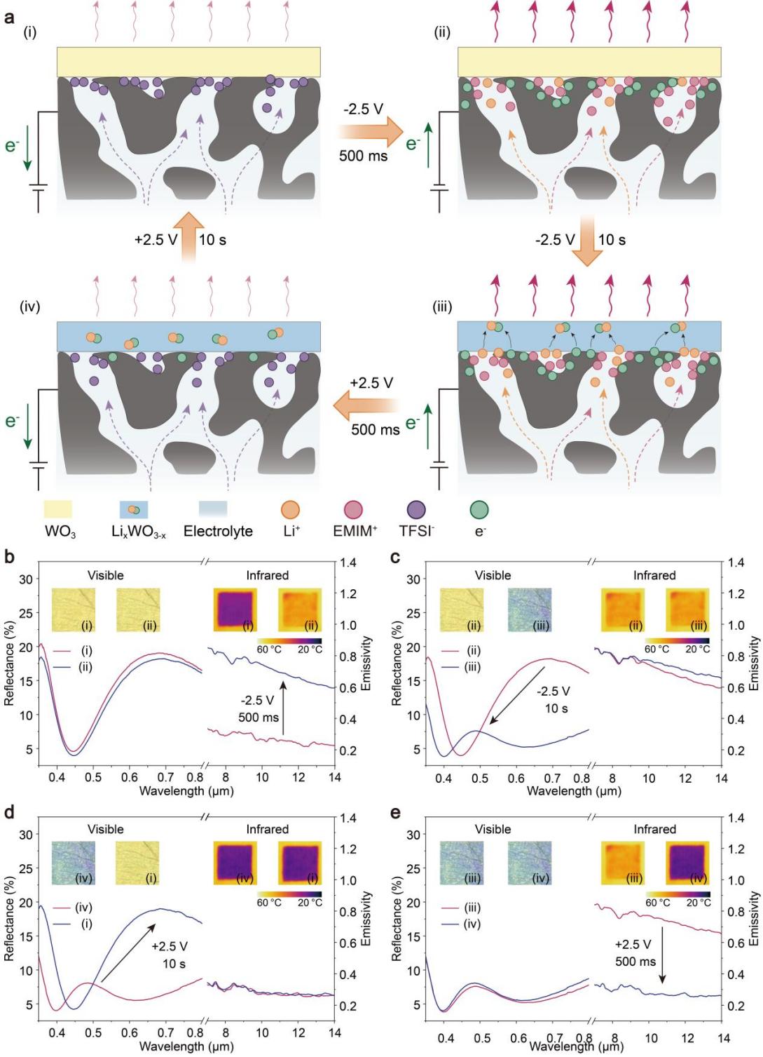 研究人员选用氧化钨(WO3)作为上层介电层/可见颜色调控功能层,并保持对长波红外透过;选择梯度致密化碳纳米管薄膜作为下层反射层/红外调控功能层。静态时,氧化钨和梯度致密化碳膜的反射表面构成布里-珀罗(FP)谐振腔,可以形成丰富的结构色(黄、橙、红、紫、蓝、青、绿等);当施加电压时,利用离子穿过梯度致密化碳膜内部的多孔结构到达不同功能层的电化学过程,可实现颜色的大幅度且精细调控(红色→橙色→绿色等),可实现红外发射率的大幅度调控(ΔℇLWIR =0.57)。有趣的是这两个过程相互独立,从而使单一表面可见光和热红外特征的解耦调控和自由组合成为可能。文章对上述现象背后的机制进行了详细研究,发现两种功能层对离子响应的特性不同,其发生反应的时间有着数量级的差别。例如,可见光颜色切换时间(着色/褪色)约为10.1 s /3.0 s,而红外发射率的高/低调制切换时间则在毫秒量级(342 ms/132 ms)内完成,因此在保持任一可见光颜色的同时,可独立调控其红外辐射率,反之亦然。
