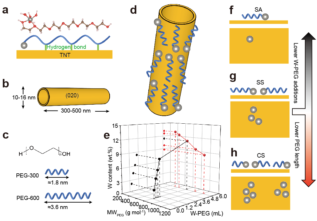 图1. 合成 W-TNT 复合材料。(a) W-PEG 的结构图及其通过氢键吸附在 TNT 表面的情况。图中棕色(C)代表碳,红色(O)代表氧,淡粉色(H)代表氢,灰色(W)代表钨。(b) TNT 的模型。(c) 不同分子量的PEG的相对长度。(d) W-PEG在TNT表面的吸附模型。(e) 两个系列的W-TNT 样品的W含量。 (f-h) 以单位点为参考,通过两种不同的负载调节策略获得孤立单原子和关联单位点。