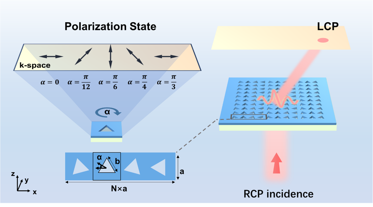图1. 基于非局域共振偏振态的相位梯度超表面的工作原理。